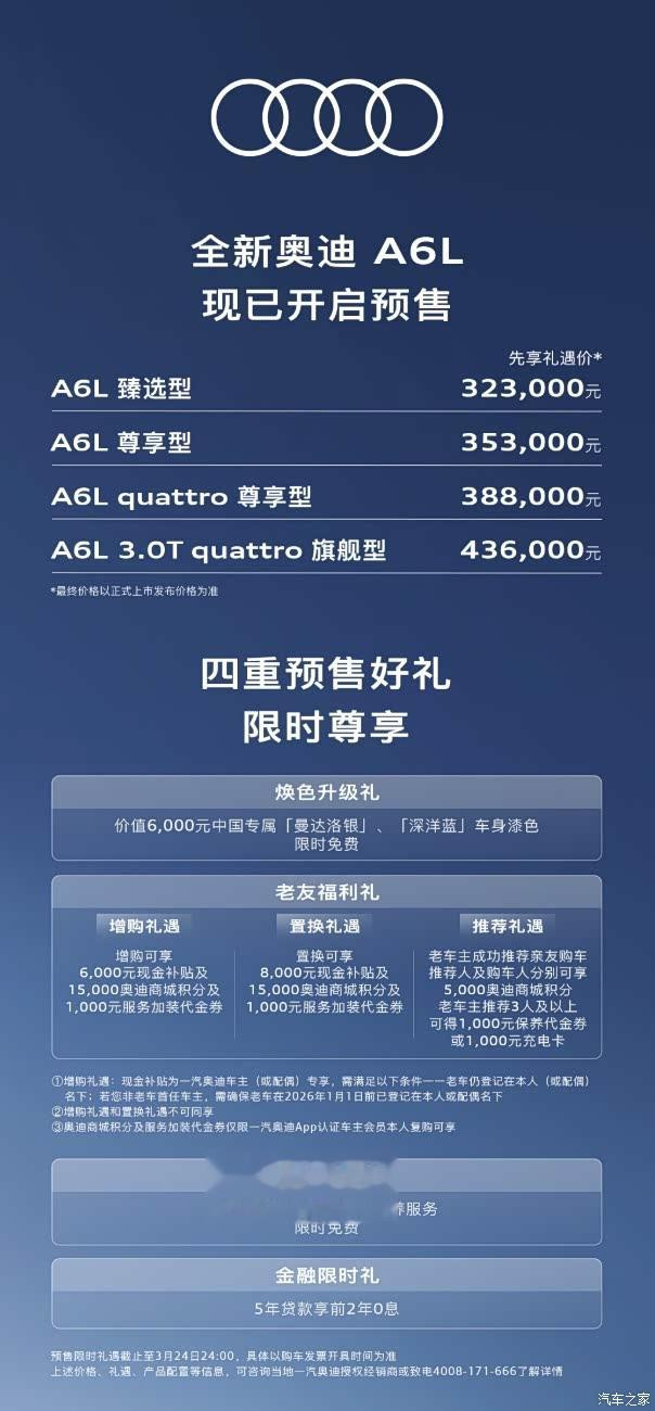 [汽车之家资讯]3月10日,我们从官方获悉,全新奥迪A6L开启预售,共推出4款车型,先享礼遇价为32.3-43.6万元,同时还推出限时四重预售好礼。全新奥迪A6L基于PPC豪华燃油车平台生产,针对外观设计、车身尺寸、智能座舱、驾驶辅助以及动力总成等多个维度均进行了升级。据悉,预计新车将于3月内正式上市。